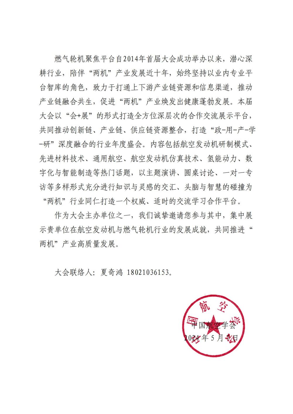 關(guān)于邀請參加“2024第十一屆航空發(fā)動機(jī)和燃?xì)?輪機(jī)聚焦大會暨展覽會”的函