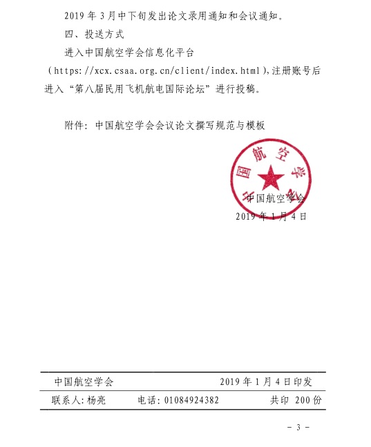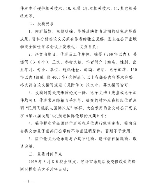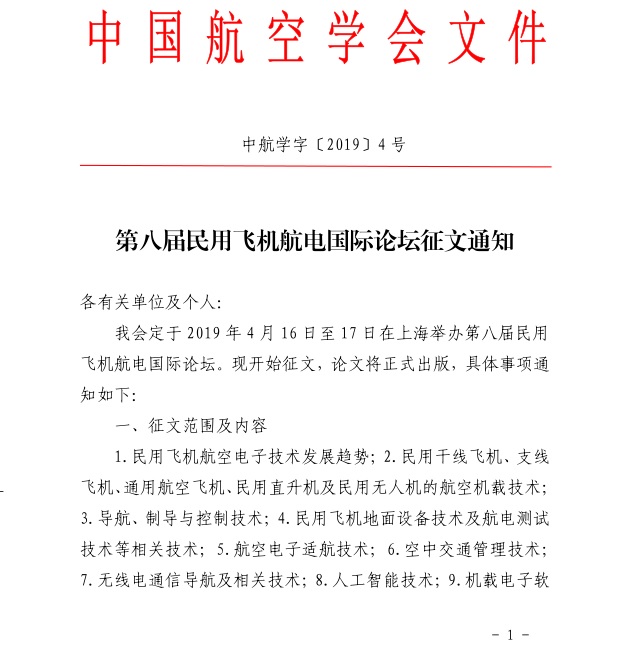 第八屆民用飛機(jī)航電國際論壇征文通知(中航學(xué)字[2019]4號)