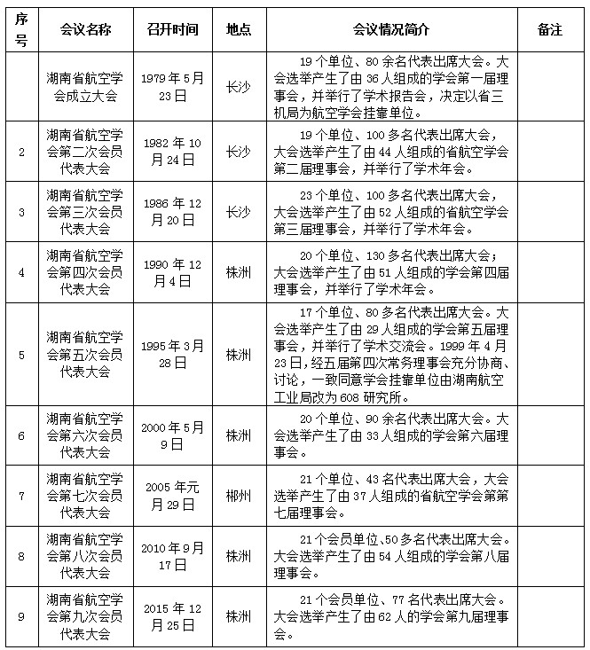 湖南省航空學會自成立以來,共召開了九次會員代表大會。會議召開具體情況如下:湖南省航空學會歷屆會員代表大會召開情況